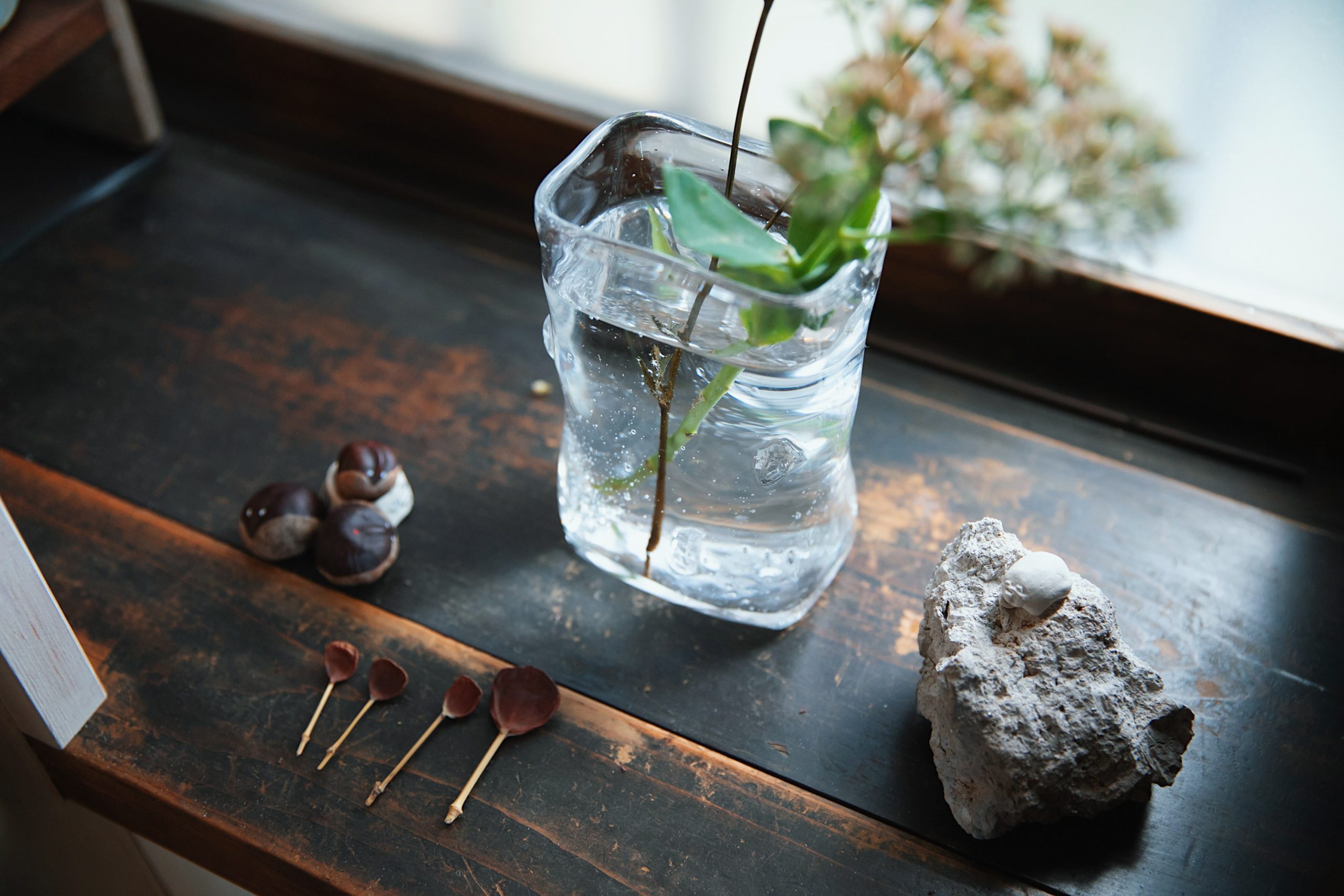 薫 : 庭にある葉っぱで、茶菓⼩の書体を作りました。